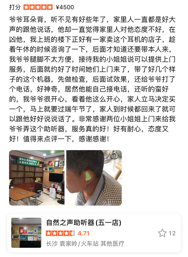 爺爺耳朵背,聽不見有好些年了,家里人一直都是好大聲的跟他說話,他卻一直覺得家里人對他態度不好,在兇他,我上班的樓下正好有一家賣這個助聽器的店子,趁著午休的時候咨詢了一下,后面才知道還要帶本人來,我爺爺腿腳不太方便,接待我的小姐姐說可以提供上門服務,后面就約好了時間她們上門來了,帶了好幾個樣子的這個機器,先做檢查,后面試效果,還給爺爺打了個電話,好神奇,居然他能自己接電話,還聽的蠻好的,我爺爺很開心,看著他這么開心,家人立馬決定買一個,馬上就要過端午節了,家人到時候都回來了就可以跟他好好說說話了。非常感謝兩位小姐姐上門來給我爺爺弄這個助聽器,服務真的好!好有耐心,態度又好!值得來點評一下,感謝感謝!